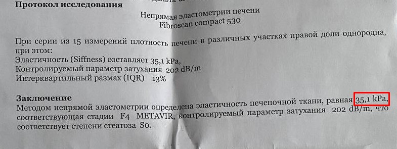 Результат эластометрии печени показал быстрое прогрессирование фиброза (с 15,8 до 35,1 кПА!):