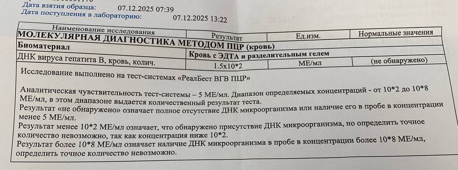 В декабре 2025 г. обратилась в нашу клинику с целью очередного контрольного обследования. Количественный анализ на ДНК вируса гепатита В: 1,5х102 МЕ/мл (т.е. по-прежнему вирусная нагрузка низкая):
