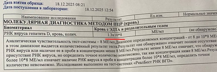 Дальнейший диагностический поиск выявил высокую активность вируса гепатита D (1,3х108 МЕ/мл):